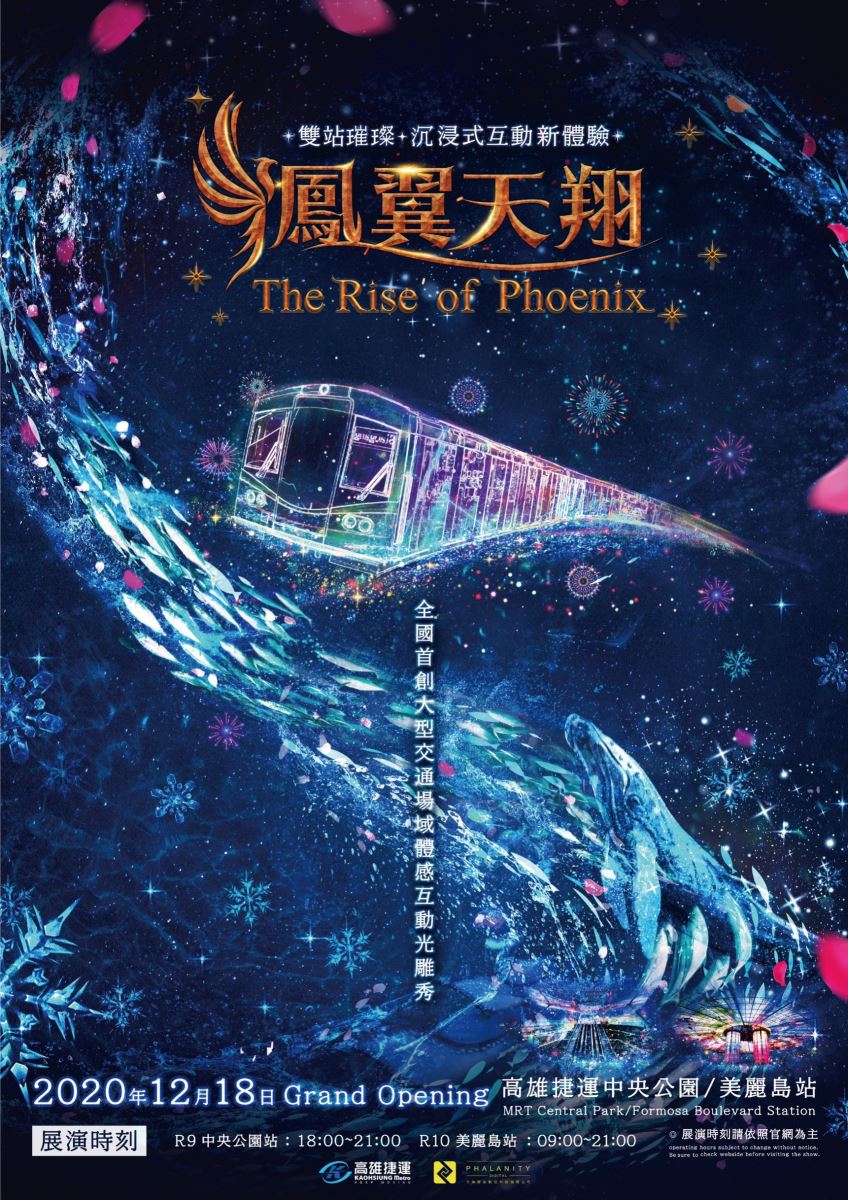時間來到2020年,藉著現代體感科技之助,高捷公司與方陣公司,把鳳凰與四聖獸的故事立體化為絢爛的光雕秀~鳳翼天翔,並重新召喚出AR聖獸,歡迎旅客造訪中央公園站與美麗島站,一起重新感受這段被埋沒的故事,並獲得鳳凰與聖獸們的祝福。Welcome to visit Formosa Boulevard and Central Park Station to get the blessings of Saint Beasts.
