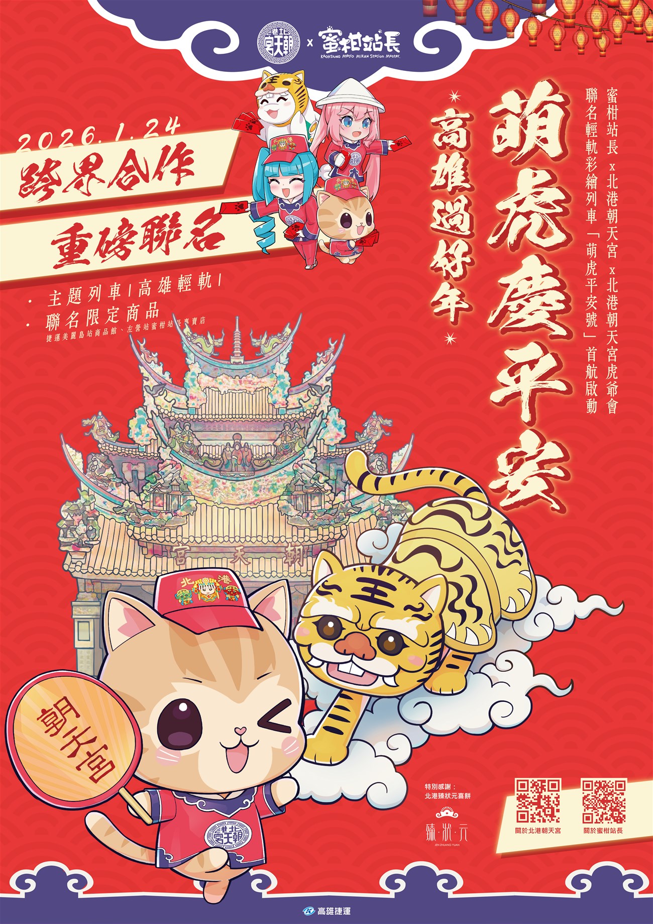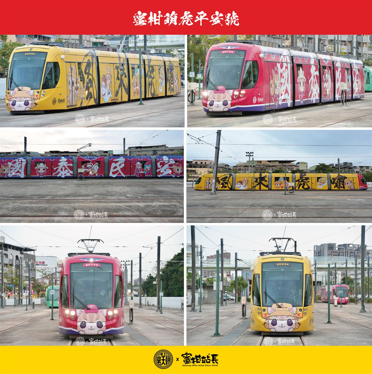 本次聯名彩繪輕軌列車為蜜柑站長與百年信仰北港朝天宮跨界合作,讓祝福隨著輕軌行駛於城市之中。